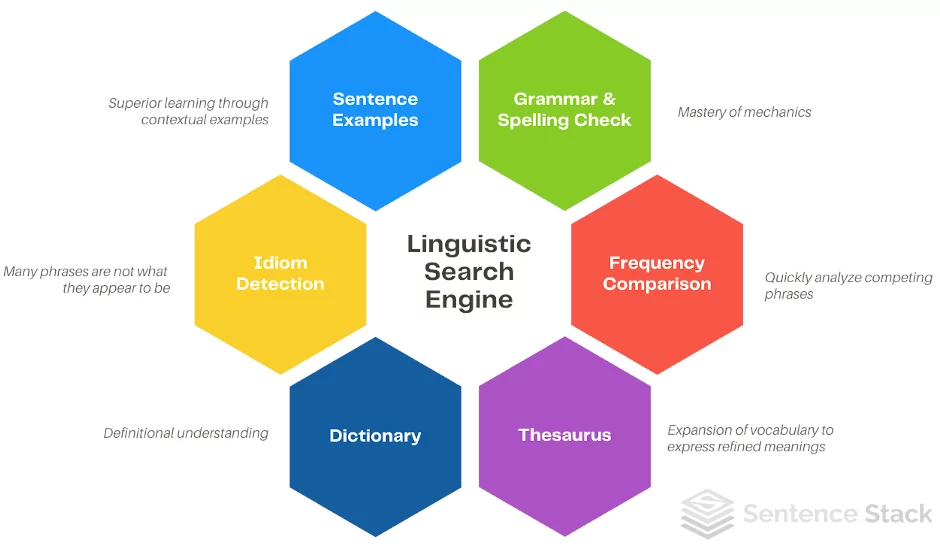 We are familiar with Internet search engines that allow us to find websites and other online resources, but relatively few are familiar with linguistic search. A linguistic search engine (LSE) facilitates learning and exploration of a language through advanced search features. These may include contextual sentence examples, idiom detection, grammar/spelling correction, phrasal frequency comparison, collocations, and more.